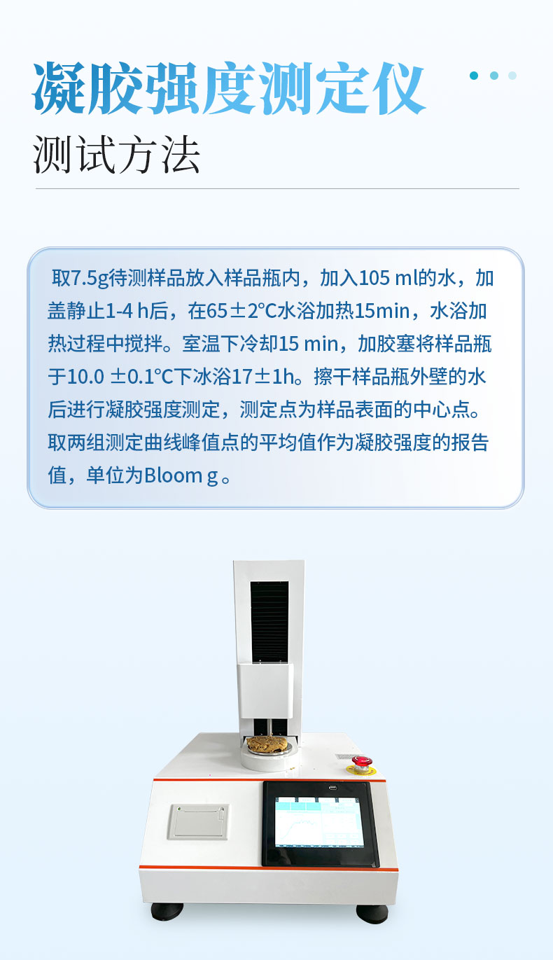 凝膠強(qiáng)度測(cè)定儀測(cè)試方法: 取7.5g待測(cè)樣品放入樣品瓶內(nèi),加入105 ml的水,加蓋靜止1-4 h后,在65±2℃水浴加熱15min,水浴加熱過程中攪拌。室溫下冷卻15 min,加膠塞將樣品瓶于10.0 ±0.1℃下冰浴17±1h。擦干樣品瓶外壁的水后進(jìn)行凝膠強(qiáng)度測(cè)定,測(cè)定點(diǎn)為樣品表面的中心點(diǎn)。取兩組測(cè)定曲線峰值點(diǎn)的平均值作為凝膠強(qiáng)度的報(bào)告值,單位為Bloom g 。